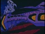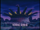| The next scene of Episode 1 in GoLion introduces the Galra (Doom) slave ship that is carrying a group of alien captives. The panning shot of the ship (Figures 27 & 28) was not cut from Voltron but was cropped to eliminate the on-screen Japanese text. Inside the ship, several captives are on the receiving end of violent whippings (Figure 29, and Figures 30 & 31 below). |