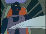 | After Kogane (Keith) makes a comment, the camera pulls back to reveal a split-screen shot of him and his team mates (Figure 19). In her father's crypt, Farla (Allura) takes a step forward towards the tomb (Figure 20). After firing a few shots at the Beastman, Farla (Allura) utters a few words (Figure 21). This shot wasn't cut from Voltron but was trimmed down -- we never see the mice with their hands up to their mouths. |